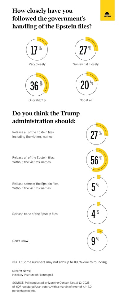 “Only a small share of voters are following the Epstein files closely, but that doesn’t mean they lack strong views. People may not know every detail, but they care deeply about fairness and accountability,” Jason Perry, director of the Hinckley Institute of Politics, told the Deseret News.