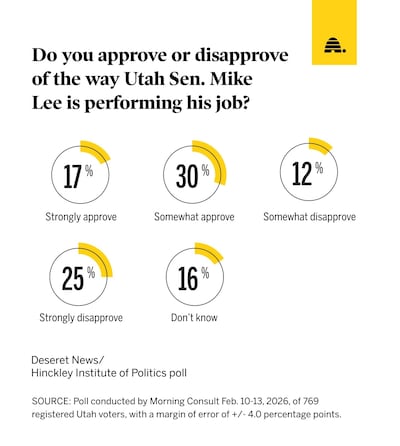 A plurality (47%) of Utah voters say they approve of Lee’s performance in the Senate compared to just 37% who say they disapprove, according to the most recent Deseret News/Hinckley Institute of Politics poll. Another 16% say they are unsure.