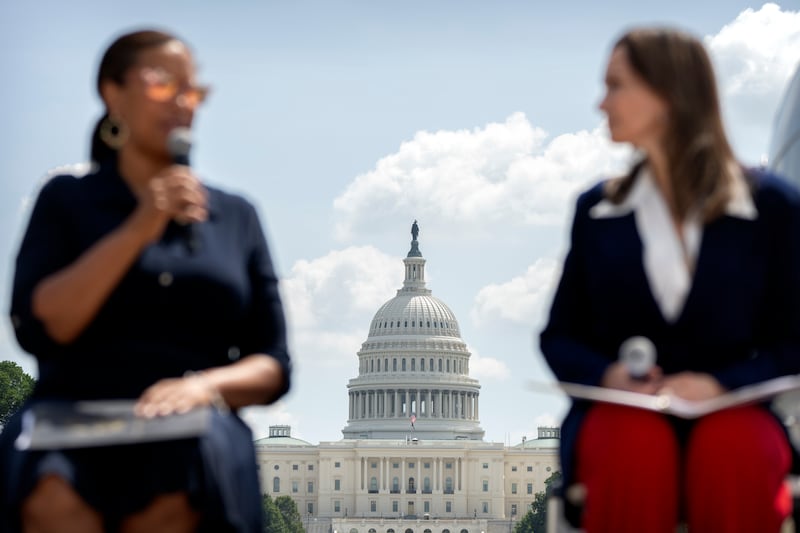 The dome of the U.S. Capitol is pictured in the background as Washington Mayor Muriel Bowser, left, and America250 chair Rosie Rios speak during an event to mark the launch of the "Our American Story" oral and visual history project ahead of the 250th anniversary of the United States in 2026, on the National Mall, Monday, July 28, 2025, in Washington. | Mark Schiefelbein, Associated Press