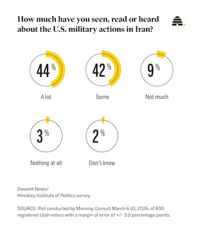 Most Utah voters say they have either seen, read or heard “a lot” (44%) or “some” (42%) about the U.S. military action in Iran.