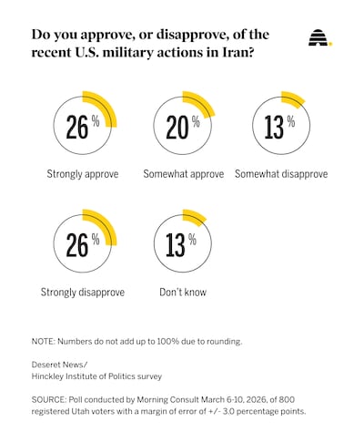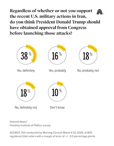 A plurality of Utahns are supportive of the war in Iran, but they also believe President Donald Trump should have gone to Congress before launching strikes, according to a new Deseret News/Hinckley Institute of Politics poll conducted by Morning Consult.