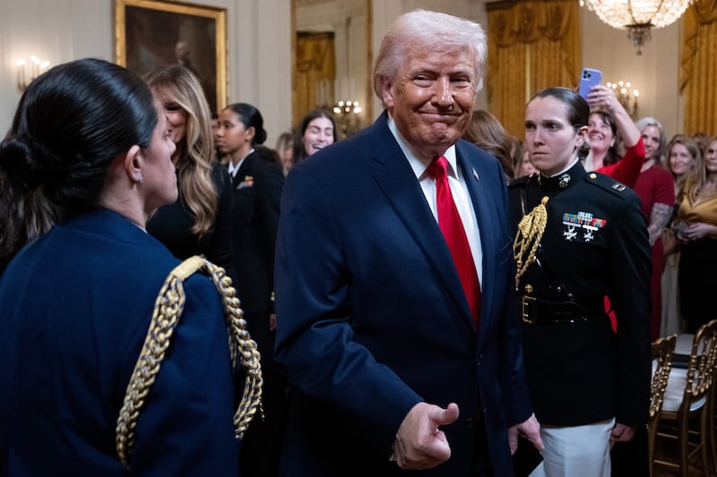 President Donald Trump departs a women's history month event in the East Room of the White House, Thursday, March 12, 2026, in Washington. | Julia Demaree Nikhinson, Associated Press
