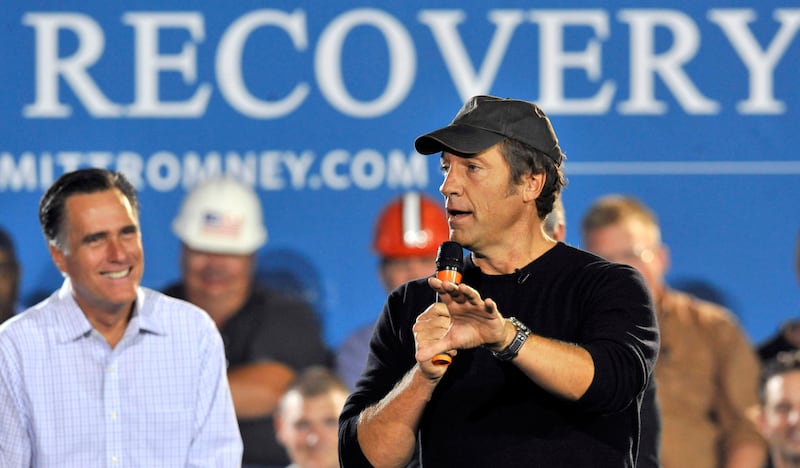 In this Sept. 26, 2012 file photo, Republican presidential candidate, former Massachusetts Gov. Mitt Romney listens as Mike Rowe, host of television show "Dirty Jobs" speaks during a campaign stop at American Spring Wire in Bedford Heights, Ohio. | David Richard, Associated Press