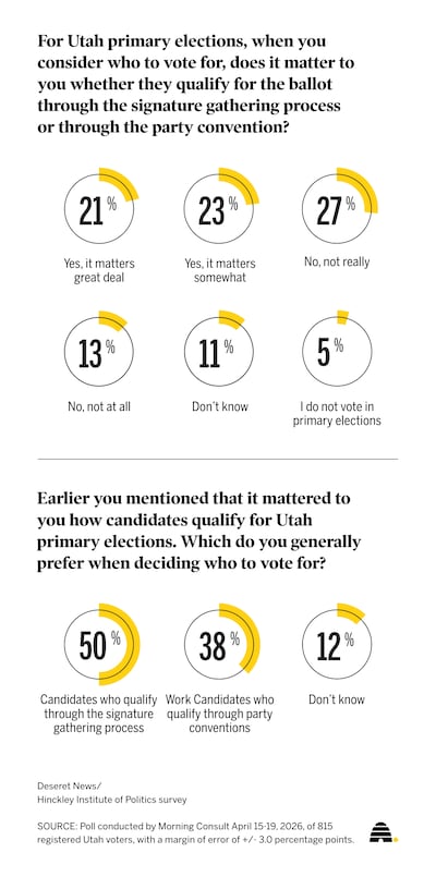 - More than 60% of Utah voters don't care how a candidate qualifies for the ballot or prefer signature gathering.