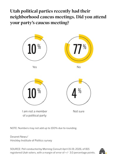 Of the 2 million registered voters in the state, 10% said they attended their neighborhood caucus meetings, according to the Deseret News-Hinckley Institute poll conducted by Morning Consult from April 15-19.