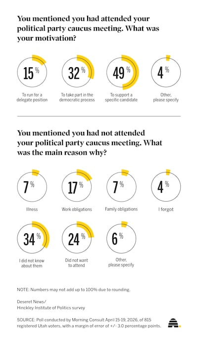 - A Deseret News-Hinckley Institute poll found that 10% of Utah voters participated in party caucus meetings.