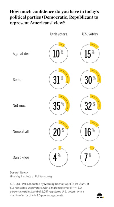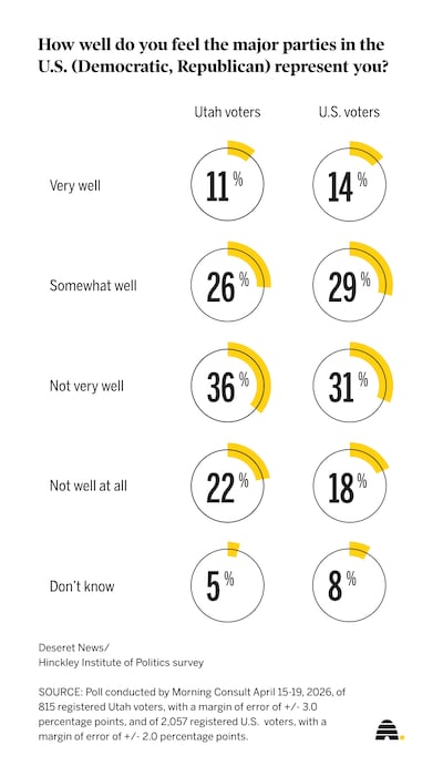 A majority of Utah voters do not feel like the Republican and Democratic parties represent their views, according to a new Deseret News-Hinckley Institute of Politics poll.