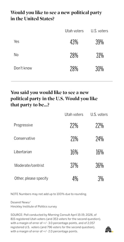 The poll found 39% of U.S. voters — and 43% of Utah voters — want a new major party. The largest share of these voters, 36%, want the party to be “moderate/centrist.” Around 1 in 5 voters say they want a more conservative party, while another 1 in 5 want a more progressive party.