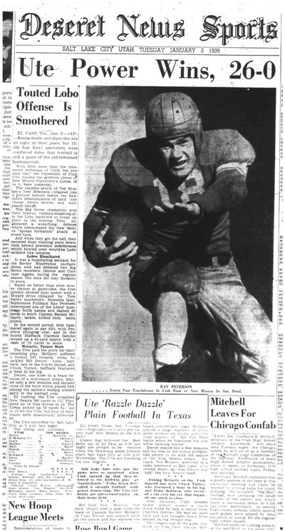 Sun Bowl, Jan. 2, 1939: Utah 26, New Mexico 0 — As one of only 10 schools in the country to receive a bowl invitation, the Utes felt special to be among the elite of college football. Ike Armstrong’s Utes had won the Mountain States Conference title with a 6-1-2 record, their only loss coming to Idaho with ties against Colorado and BYU.