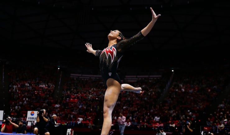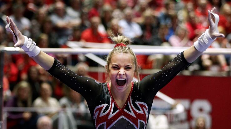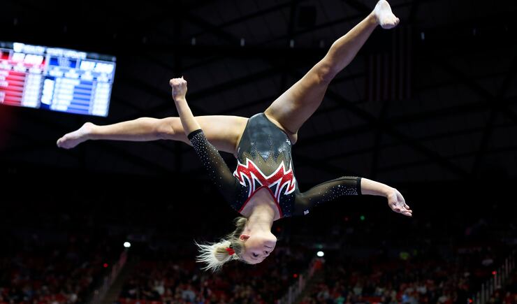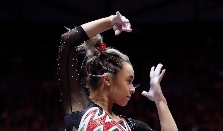 SALT LAKE CITY — College gymnastics was in the air Friday night in the foothills of Salt Lake City, which of course meant that the Jon. M Huntsman Center on the campus of the University of Utah was packed to the brim. Over 14,000 fans —14,417 to be exact — filled the stands clad in red with one goal in mind: to cheer their beloved Red Rocks on to victory.