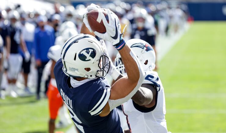 BYU’s first score of the day is a highlight-worthy one, as Zach Wilson rolls out on fourth-and-goal at the 4 and throws high to Neil Pau’u, who hauls in the pass in the corner and is able to get both feet in.