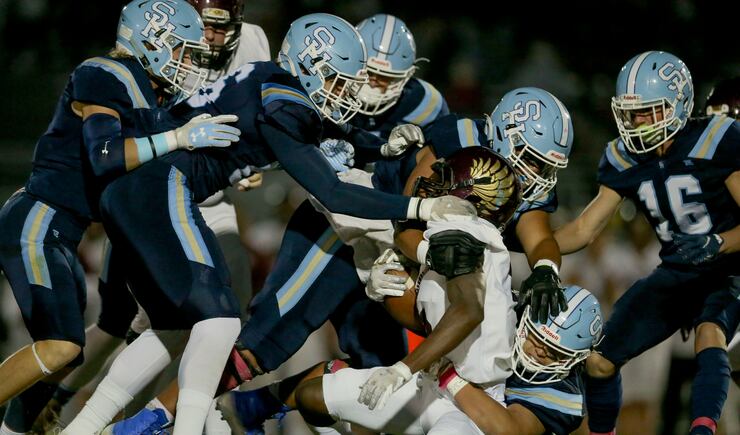 After a defensive battle in the first half, the Knights found themselves down by four before exploding for 17 points in the third quarter. Luke Durfey had two scores on the ground to push Lone Peak to victory. Kicker Benjamin Miller scored eight points in the win.