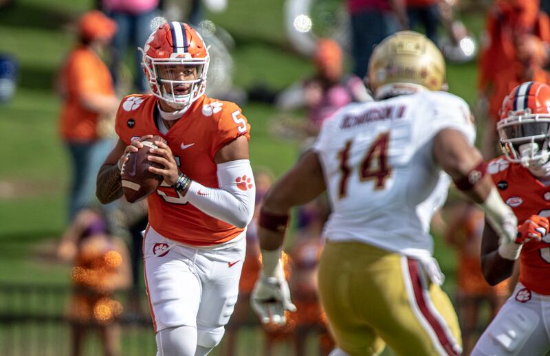 No. 1 Clemson 34, Boston College 28: The Tigers (7-0) — playing without Heisman frontrunner Trevor Lawrence, who tested positive for COVID-19 earlier in the week — scored the game’s final 24 points to avoid what would have been a monumental upset. Boston College (4-3) led 28-10 late in the second quarter before Clemson rallied behind true freshman quarterback D.J. Uiagalelei, who threw for 342 yards and two touchdowns and ran for another score in his first career start.