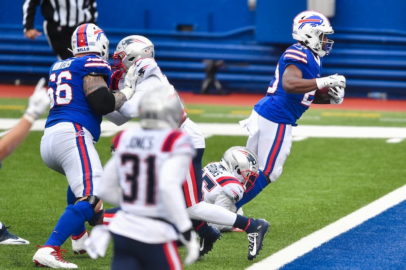 Zack Moss scored on an 8-yard run in the first quarter of Buffalo’s game against New England, giving the Bills the 7-0 lead. Moss took the handoff from Josh Allen and went through the left side of the line and went nearly untouched before falling forward into the end zone for the score with 5:34 left in the opening quarter.