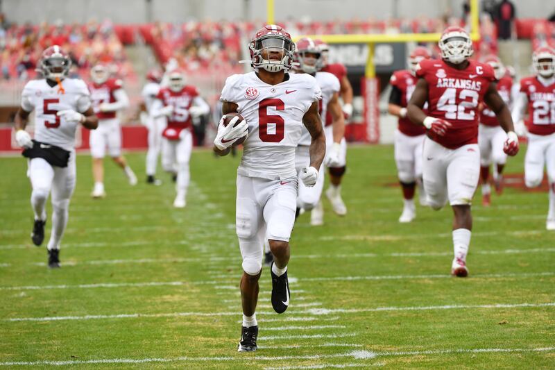 The Crimson Tide ran over the Razorbacks in the 52-3 victory, and as such Smith wasn’t needed and finished with only three receptions for 22 yards.