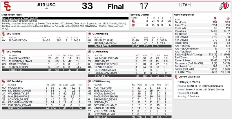 - Utah’s defense is the reason why the Utes are as close as they are. Nephi Sewell’s scoop-and-score was huge for Utah. The Utes’ young secondary has been OK so far — Slovis is 10-for-18 for 139 yards and two touchdowns, but was intercepted by Sewell, who has been the player of the game so far.