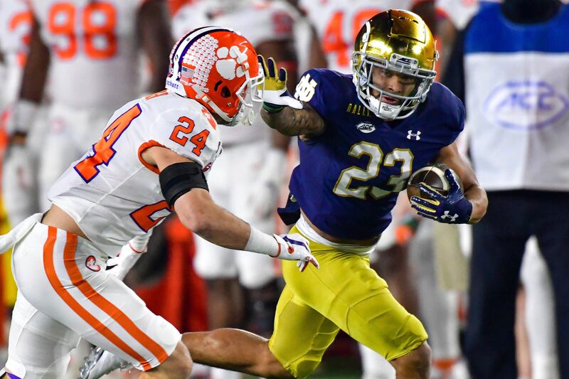 No. 4 Notre Dame 47, No. 1 Clemson 40: The Fighting Irish scored in the final minute of regulation in a back-and-forth game to force overtime. Notre Dame got the upper hand in double overtime, scoring on a 3-yard Kyren Williams run — his third score of the night — then forced a turnover on downs on Clemson’s possession to pull off the upset win.