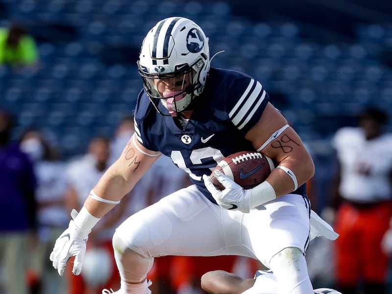 The 6-foot-1, 250-pound Wake is listed as both a tight end and fullback on the Cougars’ roster, and he made the most of limited touches on offense this season. He had five carries for 15 yards, turning two of those into touchdowns. Wake also had eight receptions for 114 yards and a touchdown — a crucial 8-yard catch for a fourth-quarter score against Houston that helped BYU rally for a 43-26 road win.