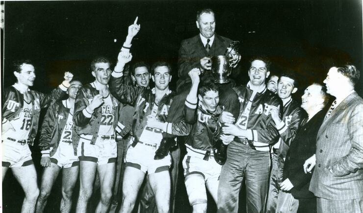 March 28, 1944 — Arnie Ferrin scored more than half of his team’s points in the NCAA championship game with 22 points in a 42-40 win over Dartmouth at Madison Square Garden. Herb Wilkinson hit a 20-footer from the top of the key in the final 10 seconds to win the game, but Ferrin earned Most Valuable Player honors. As the New York Daily News said, “Most deserving and most applauded of all was Arnold (Whitey) Ferrin, a gangly, tousled-haired 18-year-old who dominated every minute of play.”