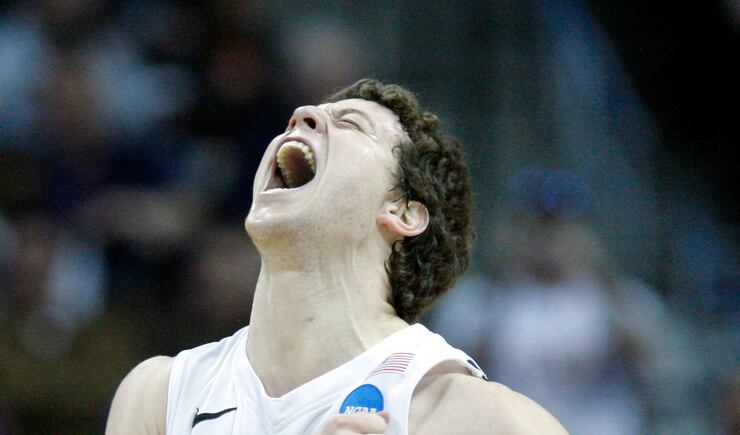 March 19, 2011 — In a season in which he was the talk of college basketball while earning National Player of the Year honors, BYU’s Jimmer Fredette also shined in the NCAA Tournament. After starting off with a 32-point night against Wofford, Fredette scored 34 points, including 7 of 12 from 3-point range, with 6 assists in an 89-67 victory over Gonzaga in a second-round game at Denver’s Pepsi Center. Fredette’s brilliant collegiate career ended the following week in an overtime loss to Florida in a Sweet 16 game in New Orleans in which he scored 32 points.