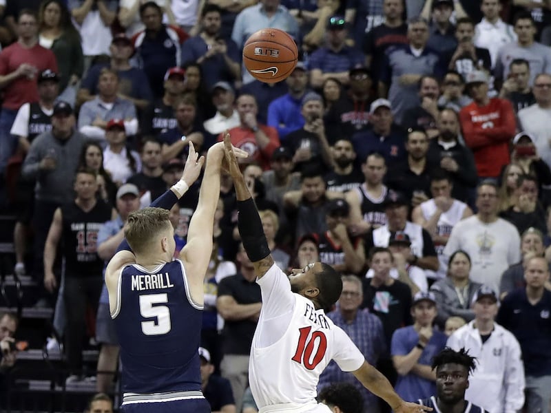 By now, the players, the setting and stakes are well-known, but here is a quick refresher. Under three seconds remained in the Mountain West Conference Tournament championship game, held at the Thomas & Mack Center in Las Vegas on Saturday, March 7. Utah State star Sam Merrill had the ball just past mid-court, guarded closely by San Diego State’s KJ Feagin.