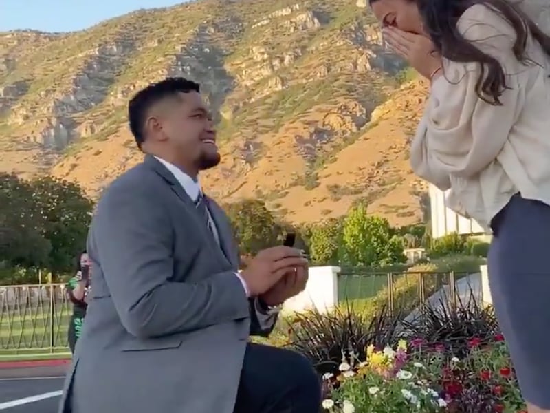 The massive Fauatea, who’s listed at 6-foot-4, 305 pounds, took his girlfriend, Chastina, on a walk in front of the Provo Temple with loved ones and love songs in the background.