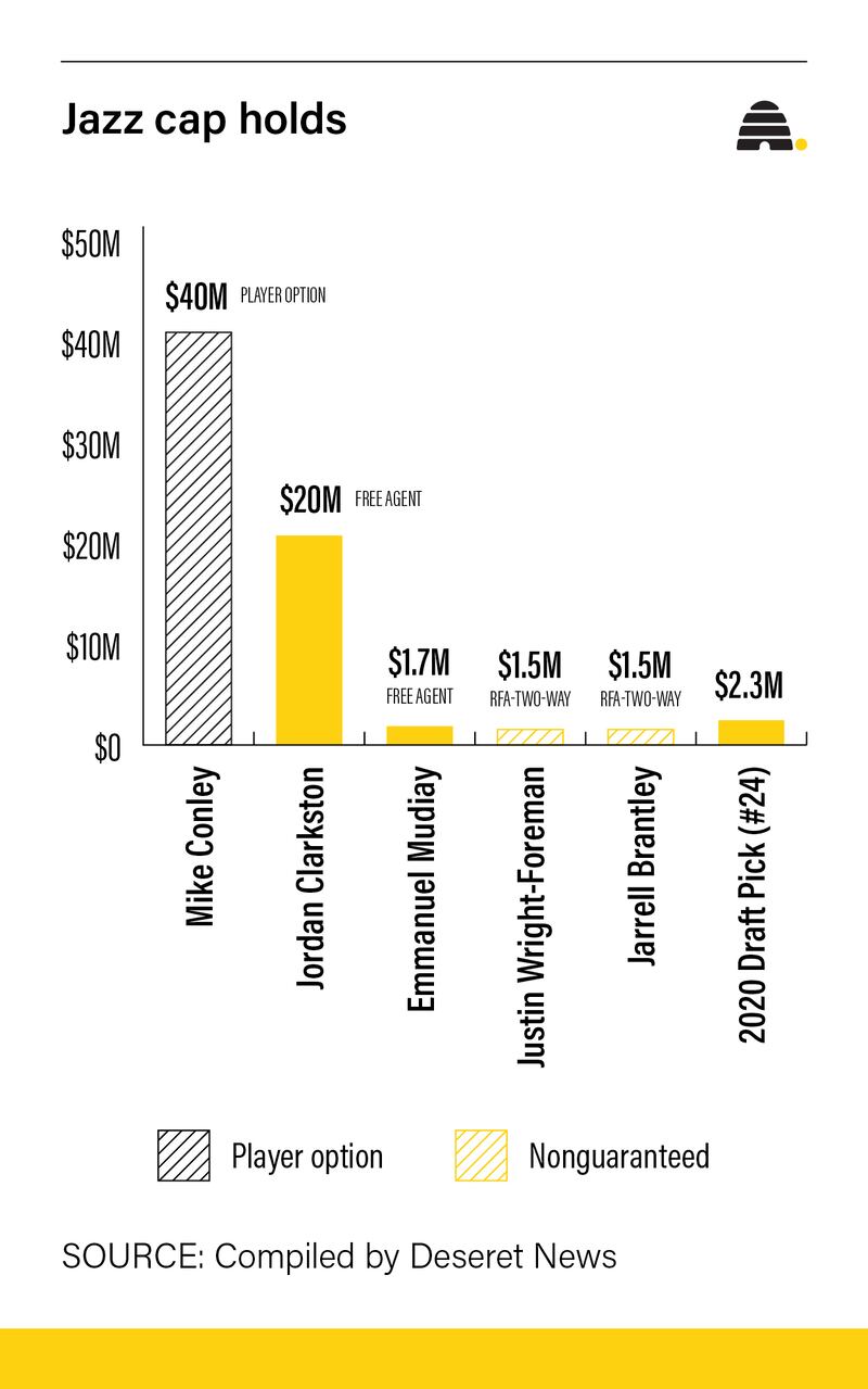 In the Jazz cap holds table you can see that Conley has a cap hold of roughly $40 million. That won’t be a factor once Conley opts in to his salary for 2020-21. Only his salary will count against the Jazz’s total cap.