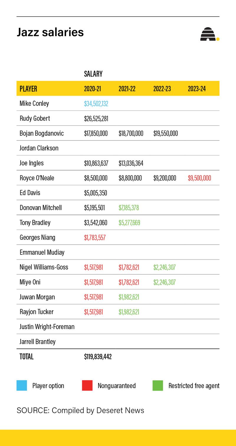 With Conley’s salary, plus the guaranteed salaries of Gobert, Mitchell, Joe Ingles, Bojan Bogdanovic, Royce O’Neale, Tony Bradley and Ed Davis, along with the non-guaranteed salaries of Georges Niang, Juwan Morgan, Miye Oni, Rayjon Tucker and Nigel Williams-Goss, the Jazz’s total team spending comes to $119,839,442. If you haven’t noticed, that’s already over the $115 projected salary cap and it doesn’t include any of the team’s cap holds.