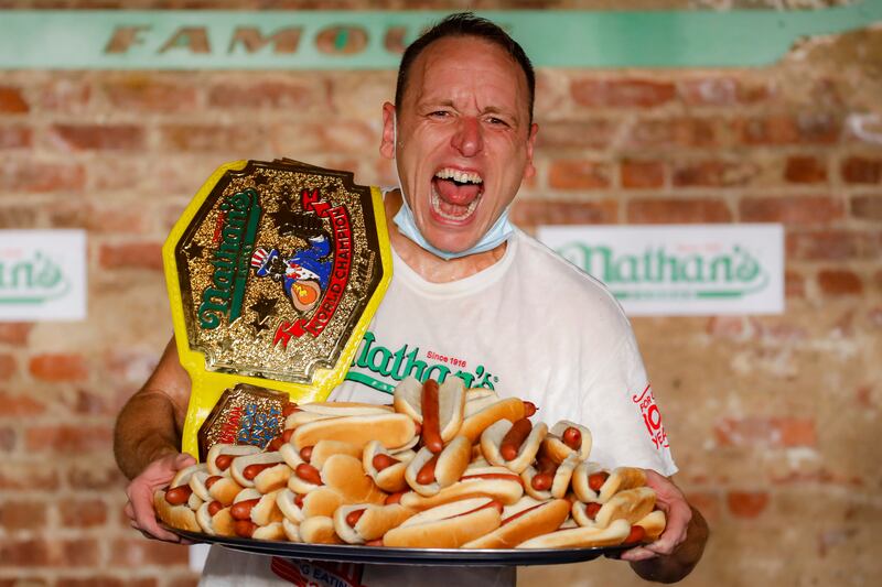 But the event that made his legend is the hot dog contest. According to ESPN, which broadcasts the event live, Chestnut consumed 21,750 calories in the process — about nine times the recommended calories for men for an entire day. The Nathan’s website claimed that Chestnut consumed about 16 pounds worth of hot dogs “or as much as 42 billiard balls!” in his 2019 victory, with 73 hot dogs.