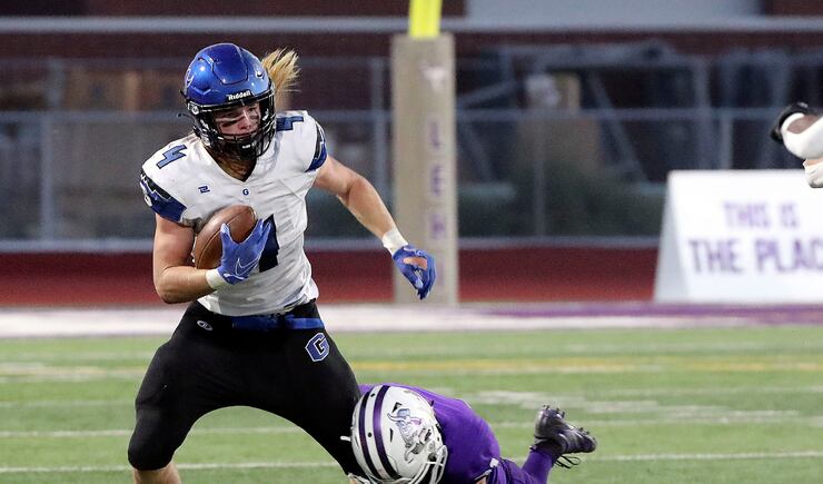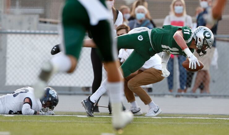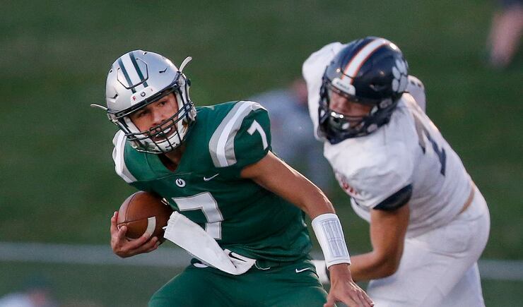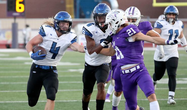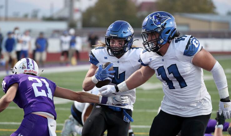 The Hawks scored early and often in the first half to take a big lead and eventually secure the victory over Grand. Morgan Bowles tossed three TD passes — finding Cole Mickel twice — and Jordan Watts rushed for another two scores in the win.