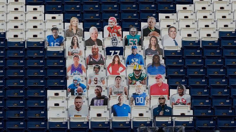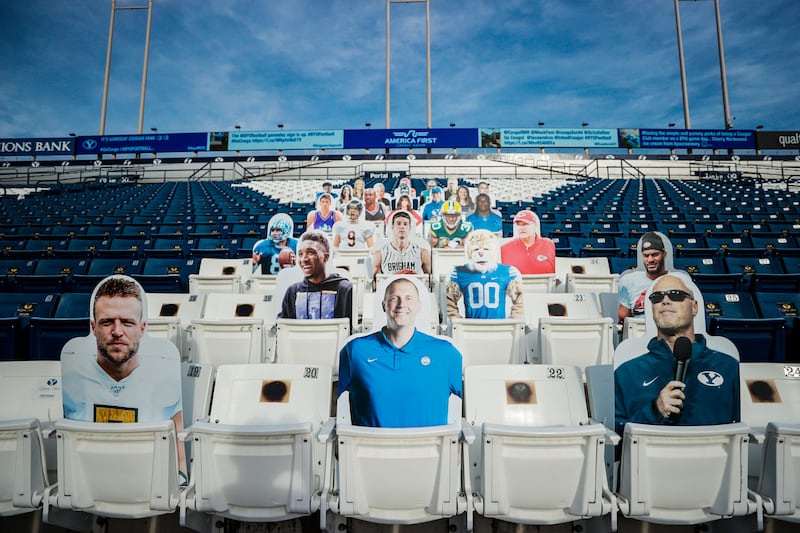 Twenty-six famous Utah ties and BYU alumni, most from the sporting world, were represented on cardboard cutouts in a close cluster in the east stands during BYU’s game against Troy.