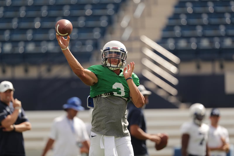 “It is going to be tough. It is going to be a hard decision, for sure. You always have to start with who we have seen play in a game before. I think it would be fair to start with Jaren (Hall) and Baylor (Romney), because we have seen those guys play, and when they played, they both played well.” — BYU offensive coordinator Aaron Roderick