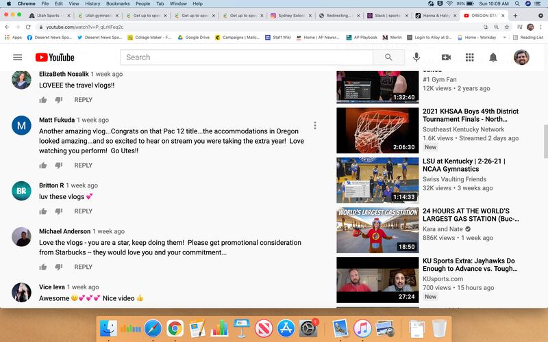 Each video is unique, centered on that week’s meet, but large cups of coffee usually make an appearance. Fellow Utah gymnasts are usually shown laughing, joking or otherwise meandering about and video of Soloski competing is always a highlight.