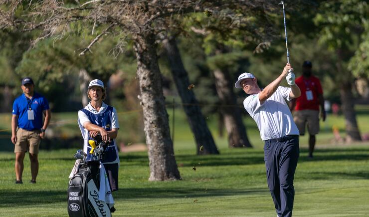 Coming up 18, and needing a par to become the clubhouse leader with seven twosomes still on the course behind him, he hit his tee shot far right. It bounced off a tree and went even further right — which was a good thing because it gave him a clear path to the green, albeit in the rough.