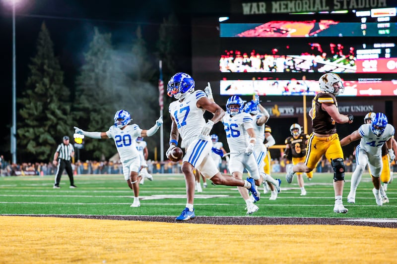 A trio of defiant defenders took shots at him on the Wyoming side of the 50, but their diving efforts missed at the 39, the 14 and lastly, the 9-yard line.