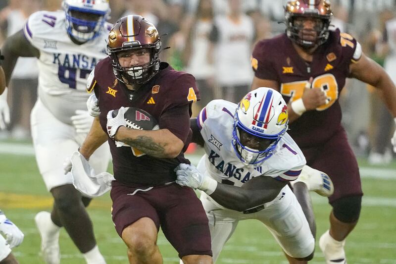 Down 17-14 early in the second half, Leavitt threw a red-zone interception that bounced off the hands of his receiver and into the hands of Kansas, but Arizona State’s defense answered the bell and forced a three-and-out. After that, aside from Kansas’ last drive with 16 seconds left, both teams scored a touchdown every time they touched the ball as the lead swung back and forth.