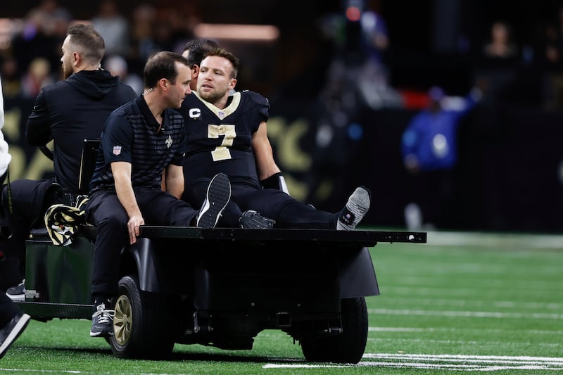 Hill was carted off the field, and he waved to Saints fans as he left.