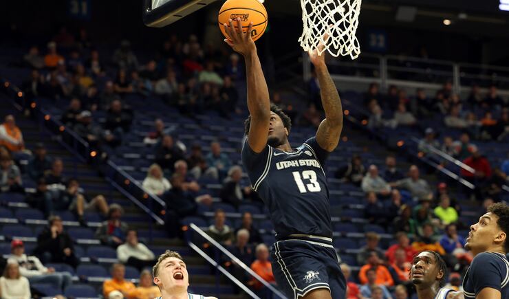 Akanno and senior forward Aubin Gateretse were displaced in Calhoun’s starting lineup in favor or sophomore Tucker Anderson and Templin, respectively. And that move initially looked good when Anderson buried a 3-pointer 90 seconds into the game to give USU’s it’s one-and-only lead of the game at 6-3. But that ended up being Anderson’s only points, while Templin, battling some larger Bruins as well as ankle and knee injuries, finished with four points and five rebounds in 20 minutes.