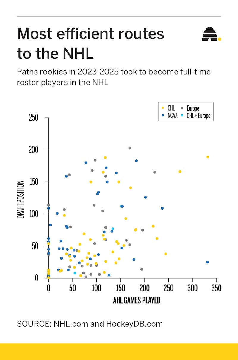 That’s characterized by the number of American Hockey League games NCAA players need to play before becoming full-time NHLers. Over the last two years, players who played enough games to break their rookie status averaged 34% fewer AHL games to get there, compared to those coming from the CHL.