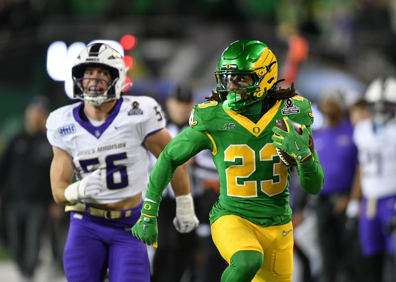 The victory was the Ducks’ seventh straight since losing to No. 1 Indiana 30-20 on Oct. 11. James Madison had won 11 in a row.
