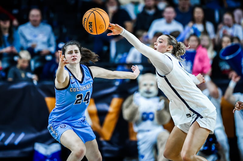 BYU guard Delaney Gibb, right, tries to steal a pass intended for Columbia's Riley Weiss during the Cougars' game against the Lions in the Women's Basketball Invitation Tournament championship game at Charles Koch Arena in Wichita, Kansas, on Wednesday, April 1, 2026. | Jaren Wilkey, BYU Photo