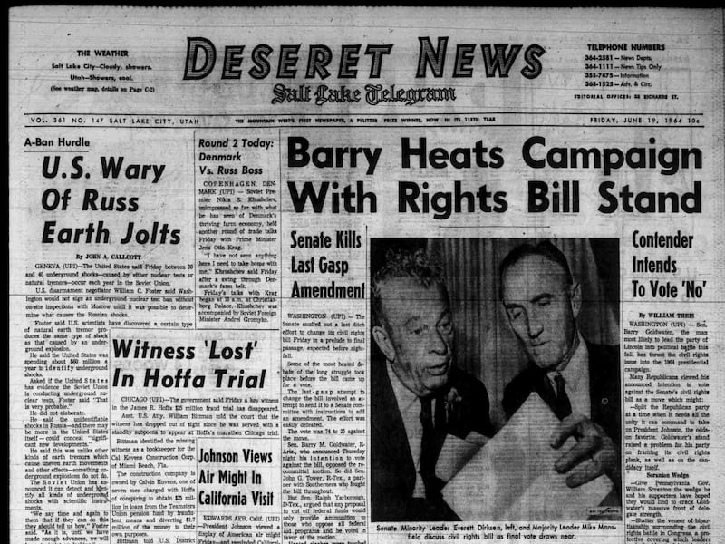 Essentially, the Civil Rights Act of 1964 outlawed discrimination on the basis of race, color, religion sex or national origin. Passage of the bill was secured after debates and amendments, but is lauded today as landmark legislation. The front page of the Deseret News, in reporting the deliberations in Washington, noted that Utah Sen. Wallace F. Bennett vowed to vote for passage of the act.