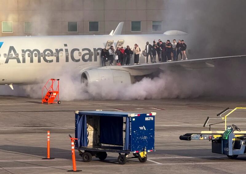 Videos from bystanders posted on social media showed passengers standing on the plane’s wing and climbing down a portable staircase, as gray smoke filled the air and orange flames could be spotted at the base of the airplane.