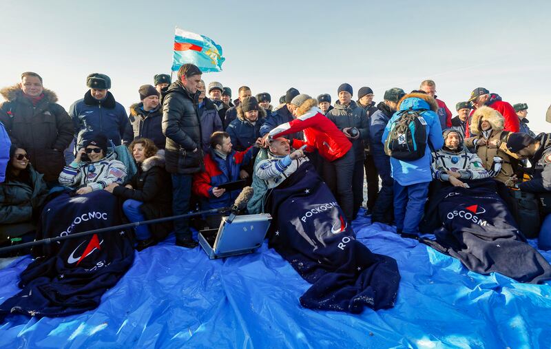 Koch smiled and gave a thumbs-up as a support team helped her out of the capsule and placed her in a chair for a quick post-flight check-up alongside her crew mates. Russian space officials said they were in good shape.
