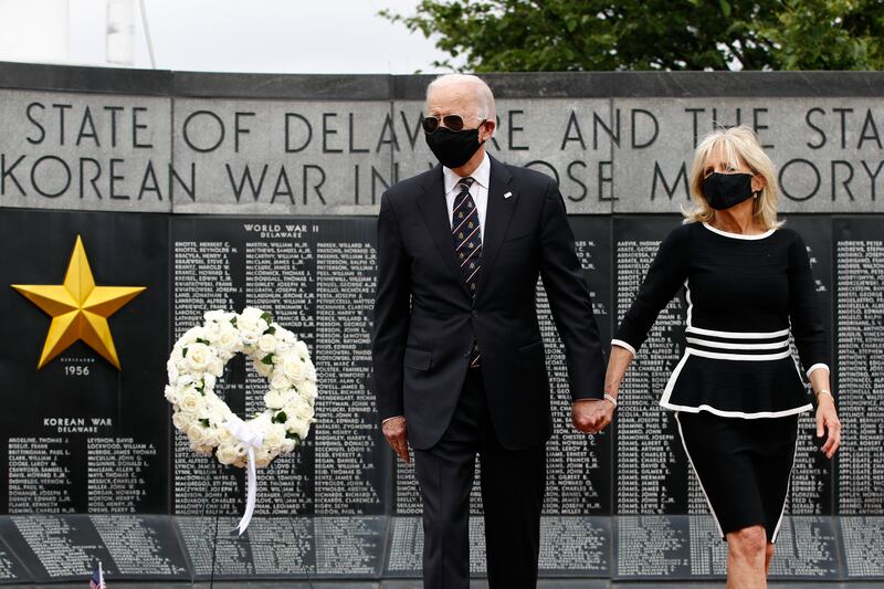 NEW CASTLE, Del. — Joe Biden made his first in-person appearance in more than two months on Monday as he marked Memorial Day by laying a wreath at a veterans park near his Delaware home.