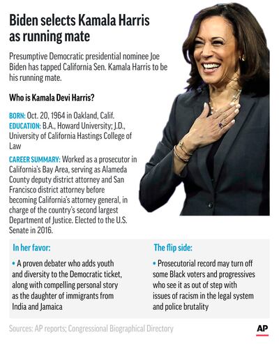 Biden, a 77-year-old white man, embraced the significance of naming the first Black woman to a major party’s presidential ticket, but he also focused on other attributes Harris brings to the ticket. He hailed the California senator, the 55-year-old former prosecutor who a year ago excoriated Biden on a primary debate stage, as the right woman to help him defeat Trump and then lead a nation facing crises in triplicate: a pandemic, wounded economy and long-simmering reckoning with racism.