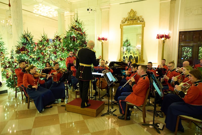 Christmas at the White House also nods to a unique milestone: the nation’s 250th anniversary. Patriotic displays in the East Room incorporate red, white and blue motifs. The Green Room features two presidential portraits made of more than 6,000 puzzle pieces, giving “families the chance to be challenged, have fun and use their imagination together,” a White House email details.