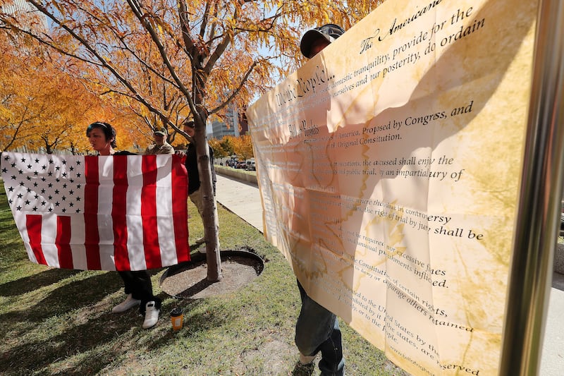 Koerber is the victim of a “political prosecution” because he angered Utah Republican leaders starting with his support of a public school voucher initiative 15 years ago, Bundy said, speaking behind a garbage can from which a cardboard sign reading, “Bill of Rights?” dangled.