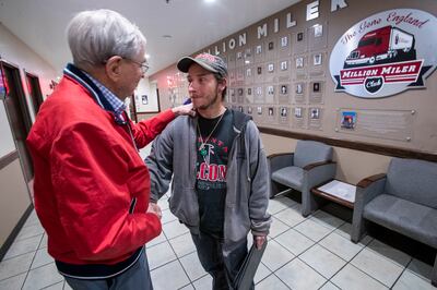 In the halls of the headquarters, truck-drivers-in-training — recognizing him — light up and line up to shake his hand.