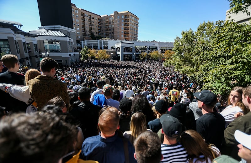 The crowd roared in approval. They had been waiting all morning for him, and were happy to cheer for him. West, who has been touring the nation with these events, only performed one song — “Jesus Walks,” one of his biggest hits — during his brief appearance at The Gateway in Salt Lake City Saturday.
